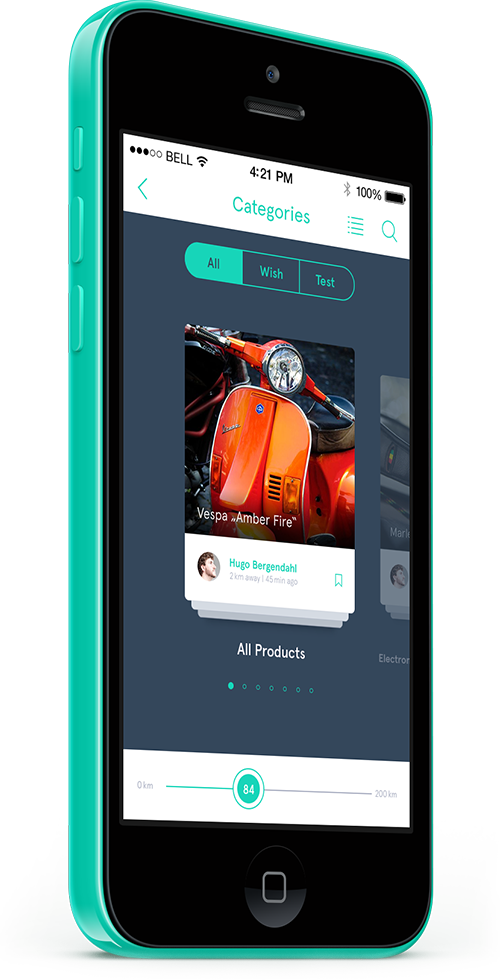 Products can easily be browsed by the swipe of your thumb. You can send an instant contact request by using the chat, or you add the current product to your favourites and save it for later.